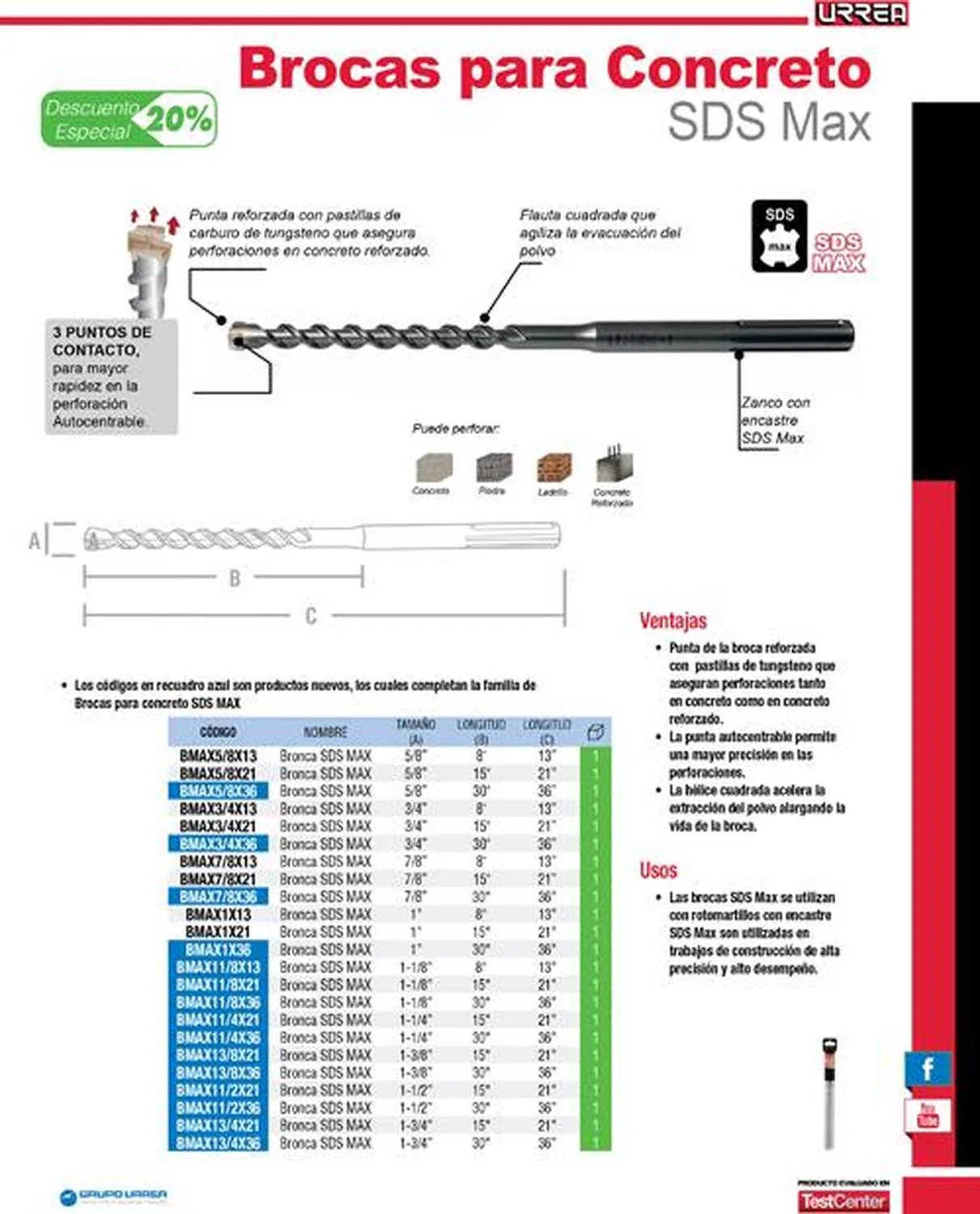 MARCA: Urrea DESCRIPCION DEL PRODUCTO: -Diámetro: 1-1/8″. Longitud de hélice: 15″ . Longitud total: 21″. Tipo de encastre: SDS Max.-Material de la punta: Carburo de Tungsteno. Ángulo de hélice: 135°.-Máxima energía de impacto: 19 Joules. ESPECIFICACIONES TECNICAS: -Largo Hélice: 15″-Largo Total: 21″-Medida: 1 1/8″ CONTENIDO DEL PAQUETE: 1 Broca SDS Max. GARANTIA: Sin garantía ALTO EN CM: 3.7 LARGO EN CM: 60 FONDO EN CM: 3.7 PESO EN KG: 1.4