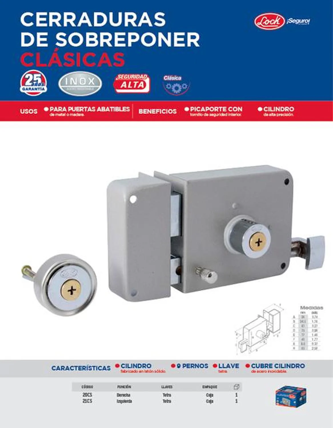 MARCA: Lock DESCRIPCION DEL PRODUCTO: -Cubre cilindro de acero inoxidable. Cerrojo de dos pasos. Alta seguridad. 9 pernos en cilindro exterior. Clásica-Llave tetra. Barrenos de sujeción compatibles con otras marcas. Picaporte con tornillo de seguridad interior.-Instalación lado derecho de la puerta. Cilindro fabricado en latón sólido. Resistente a la intemperie. -Cerradura de sobreponer clásica para puertas de metal o madera. Alto nivel de seguridad. -Disponible para puertas izquierda y derecha, y con diferentes tipos de llaves. Materiales resistentes que le otorgan una gran durabilidad. ESPECIFICACIONES TECNICAS: CONTENIDO DEL PAQUETE: Cerradura de sobreponer, 3 llaves, tornillería y accesorios e instructivo con plantilla. GARANTIA: 25 años ALTO EN CM: 9 LARGO EN CM: 14 FONDO EN CM: 8.5 PESO EN KG: 0.742