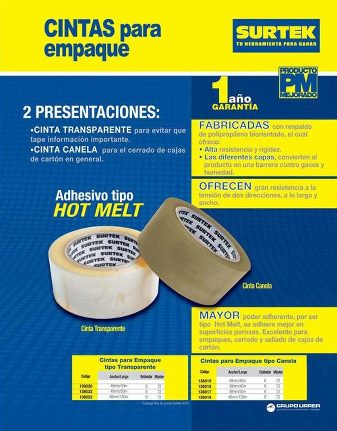 MARCA: Surtek DESCRIPCION DEL PRODUCTO: -Cinta transparente hot melt para empaque 2″ x 40m Surtek-Fabricada con respaldo de polipropileno biorientado que ofrece gran resistencia a la tensión en dos direcciones, a lo largo y ancho-Adhesivo tipo Hot Melt, con mayor poder adherente en superficies porosas-Excelente para empaques, cerrado y sellado de cajas de cartón-Para evitar que tape información importante-Espesor de 0.045mm ESPECIFICACIONES TECNICAS: -Adhesivo: Hot Melt-Ancho: 2 Inch-Color: Transparente-Forma: Rollo-Fuerza De Adhesión: 18 Oz/Pulg-Grosor: 0.045 Mm-Longitud: 40 M-Material: Polipropileno-Resistencia A La Tensión: 3.4 Kg/Cm-Temperatura De Desempeño: 6° A 36° C-Precio De Venta Libre: Si CONTENIDO DEL PAQUETE: Cinta transparente hot melt para empaque 2″ x 40m Surtek GARANTIA: ALTO EN CM: 4.8 LARGO EN CM: 9.4 FONDO EN CM: 9.4 PESO EN KG: 0.09