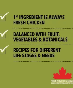 - El primer ingrediente es pollo canadiense fresco. Nuestros ingredientes frescos utilizan la refrigeración como único método de conservación y nuestros ingredientes crudos se congelan en su máxima frescura.