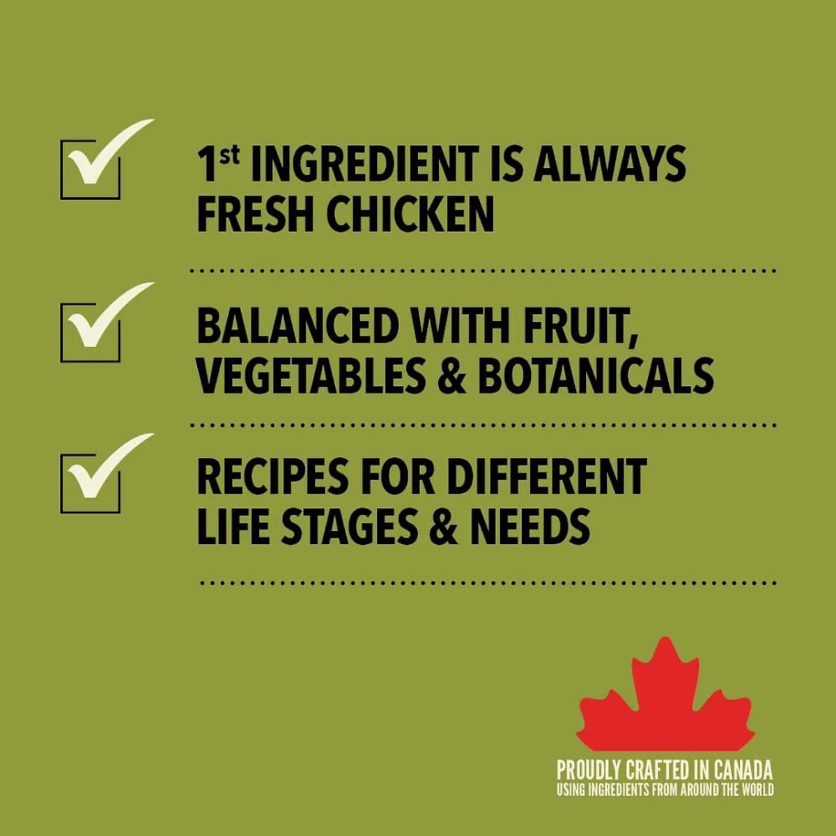 Pollo fresco (20,5%), harina de pollo (20%), lentejas rojas enteras, guisantes verdes enteros, fibra de guisante, menudillos de pollo frescos (hígado, corazón) (5%), harina de pavo (5%), harina de arenque (4%), huevos (4%), platija cruda (4%), garbanzos enteros, lentejas verdes enteras, guisantes amarillos enteros, almidón de guisante, grasa de pollo (1%), aceite de pescado (1%), hígados de pavo crudos (0,5%), sal, algas secas, calabaza fresca entera, calabaza de calabaza entera fresca, zanahorias enteras, manzanas enteras, peras enteras, calabacín fresco. 5%), sal, algas secas, calabaza fresca entera, calabaza fresca entera, zanahorias frescas enteras, manzanas frescas enteras, peras frescas enteras, calabacines frescos enteros, raíz de achicoria seca, col rizada fresca, espinacas frescas, hojas de nabo frescas, hojas de remolacha frescas enteras, arándanos frescos enteros, bayas de saskatoon frescas enteras, cúrcuma, cardo mariano, raíz de bardana, lavanda, raíz de malvavisco, escaramujos.