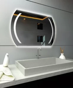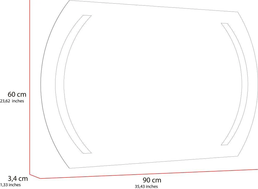 Espejo rectangular con extremos laterales curvos, con diseño en sandblasting, luz led y ensamble a la pared con chaflan. Incluye herrajes para su instalación.