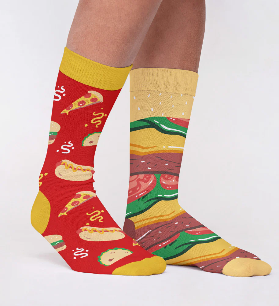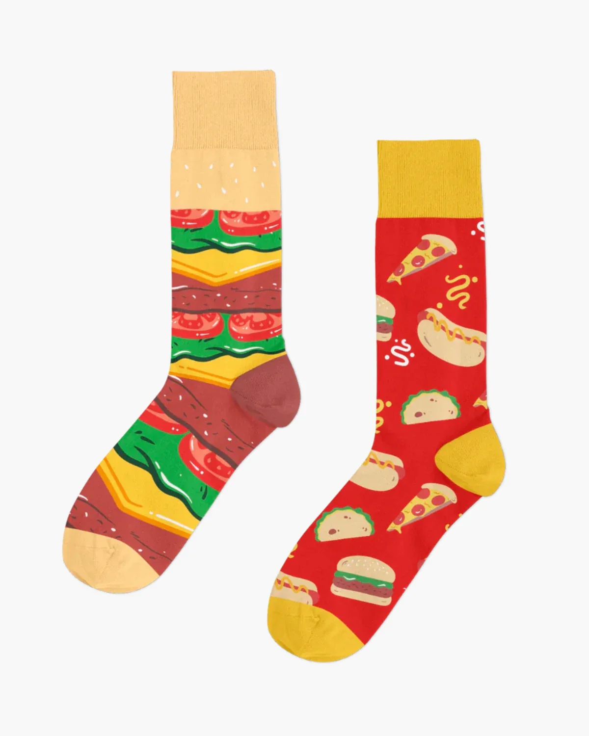 Experimenta la delicia de nuestro paquete de calcetines temáticos de comida: hamburguesas, pizza y hotdogs. Con diseños divertidos y colores vibrantes, son perfectos para los amantes de la comida y el estilo único. ¡Ponte cómodo con el sabor de la moda!