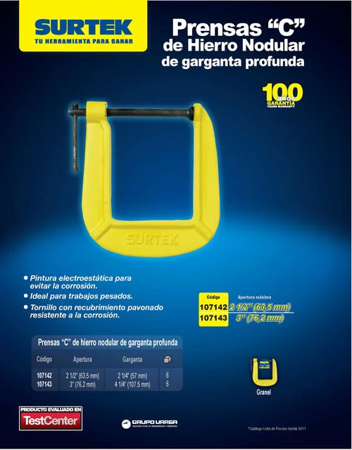 Características: -Prensa “C” de hierro nodular 3″ de garganta profunda Surtek