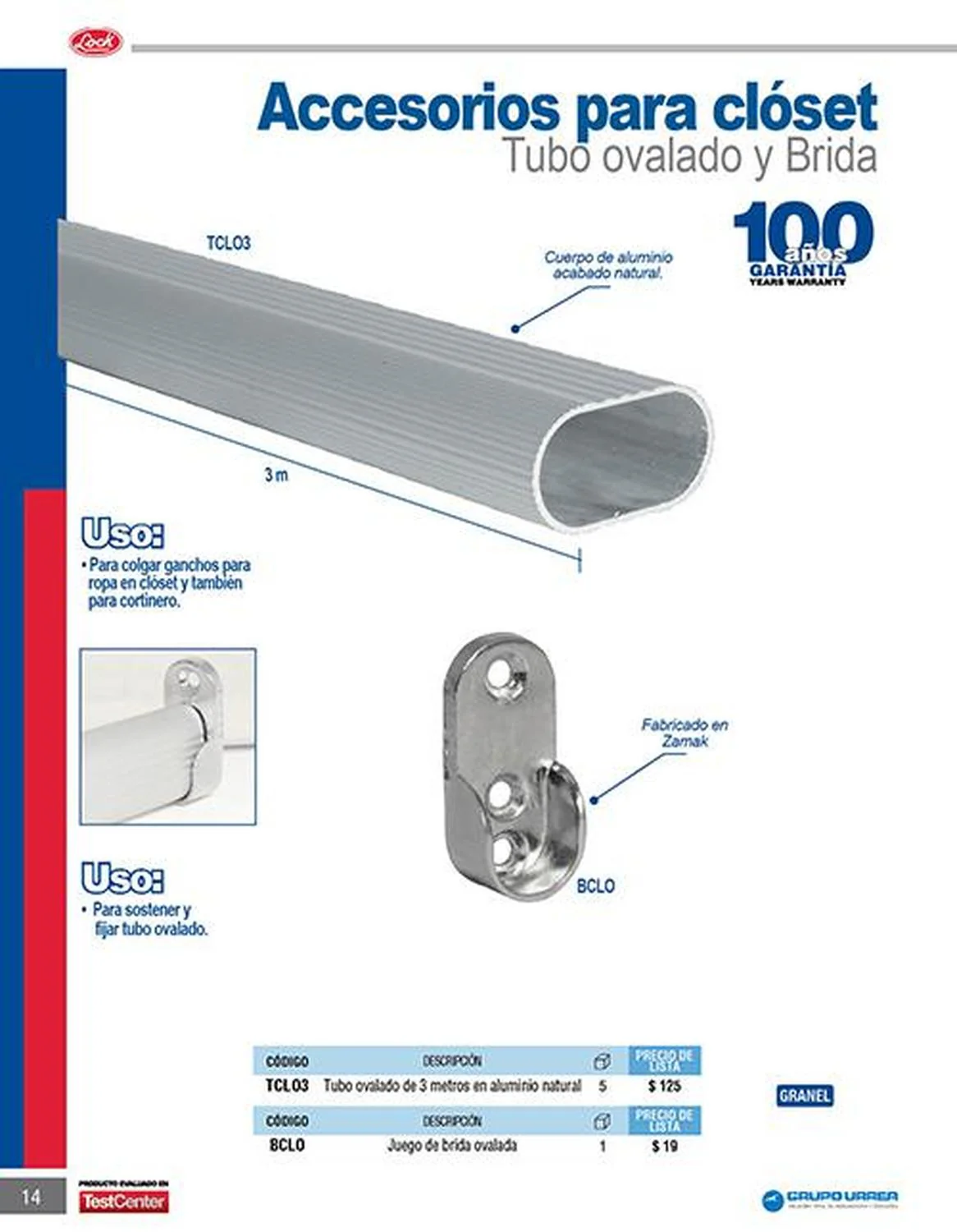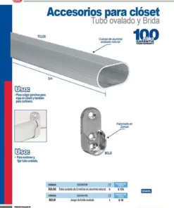 MARCA: Lock DESCRIPCION DEL PRODUCTO: -Tubo ovalado de 3 metros para closet.-Cuerpo de aluminio acabado natural.-Fácil instalación.-Para colgar ganchos para ropa en closet y también para cortinero.-Longitud de 3 metros ESPECIFICACIONES TECNICAS: -Longitud: 3 Metros-Material: Aluminio CONTENIDO DEL PAQUETE: Tubo ovalado GARANTIA: 1 año ALTO EN CM: 2.5 LARGO EN CM: 2 FONDO EN CM: 305 PESO EN KG: 0.2
